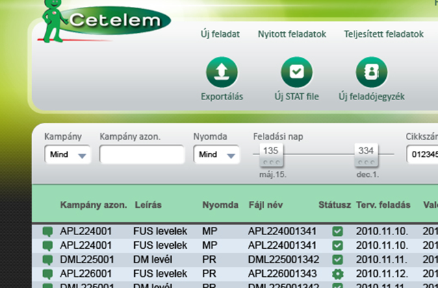 A Cetelem logisztikai osztálya számára készült az első, bemutatkozó munkánk. Feladatunk volt megérteni egy egyedi vállalati folyamatot, a bank különböző postán kézbesítendő anyagainak (egyenlegközlők, tájékoztatók, hirdetmények, felszólítások stb.) munkafolyamatát, azok kontrollálását, elszámolásait és eredményeit.