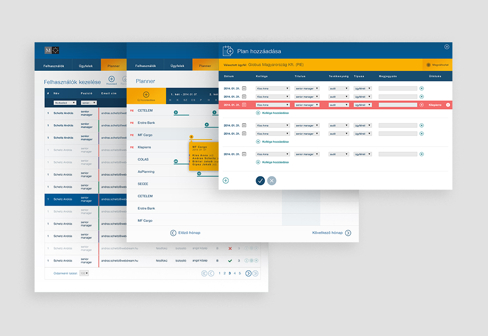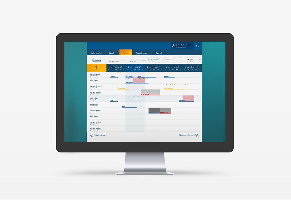 Egyik jelentősebb fejlesztési projektünk eredménye volt az a webes alkalmazás, amely a megkötött partneri szerződésekre támaszkodva segít megtervezni a projekt csapatok egész éves beosztását. A Planner segítségével a teljes ügyfél portfólióra és teljes munkatárs állományra elkészíthető a komplett projektbeosztás és ütemezés. A rendszerben könnyen kezelhetők az ütközések, és a gyors áttekintés érdekében a tervezőfelület számtalan ügyfélparamétert jelenít meg különféle jelölésekkel.